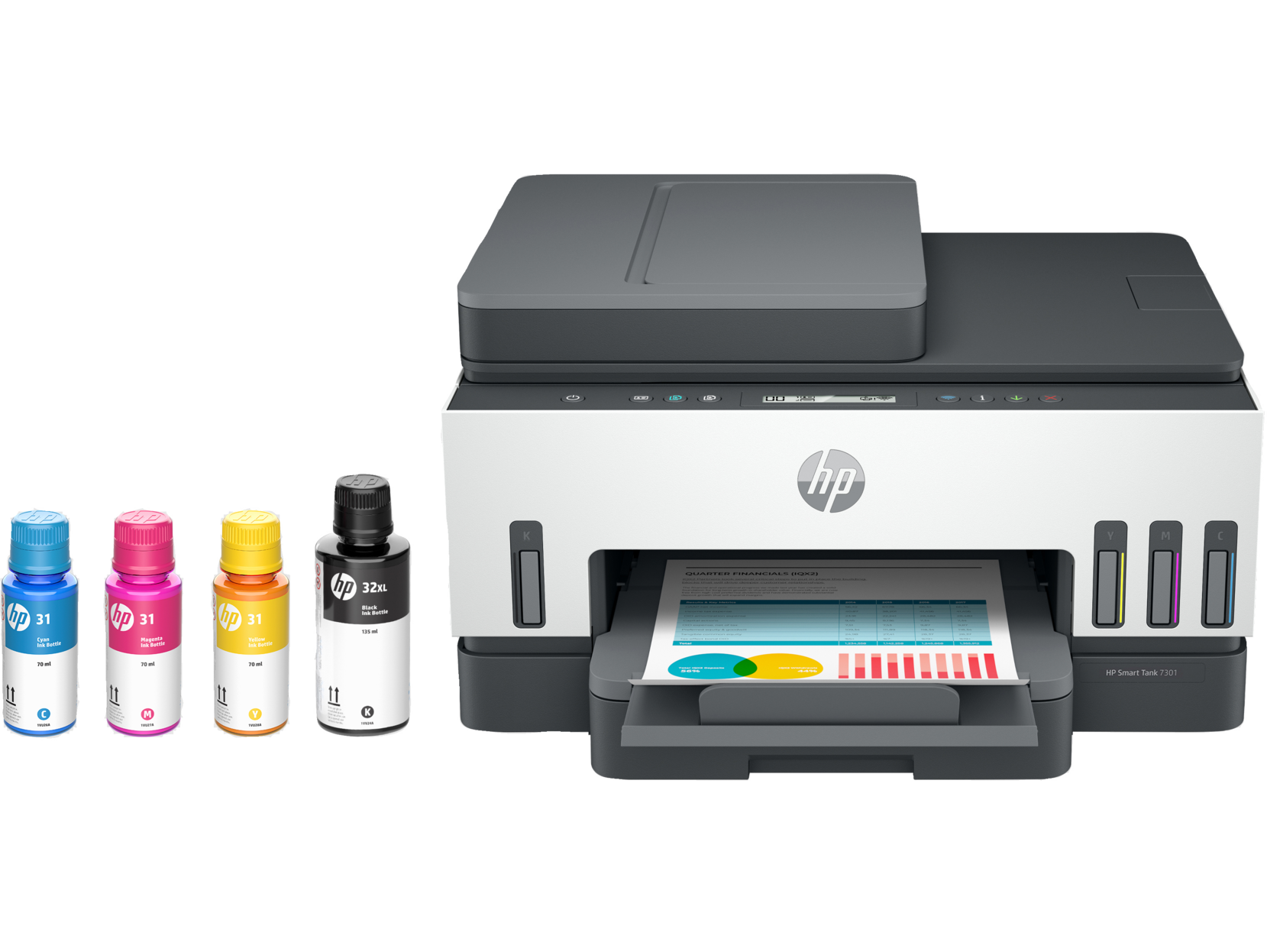 Printer, HP 32XL Black + HP 31 Cyan, Magenta, Yellow Bottles, Setup + Regulatory Flyers, Power cord |